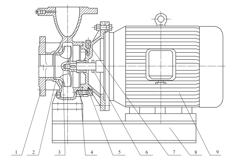 | Pump casing | Impeller | Impeller nut | Mechanical seal | Pump cover | Water-blocking ring | Plug | Foundation | Motor |